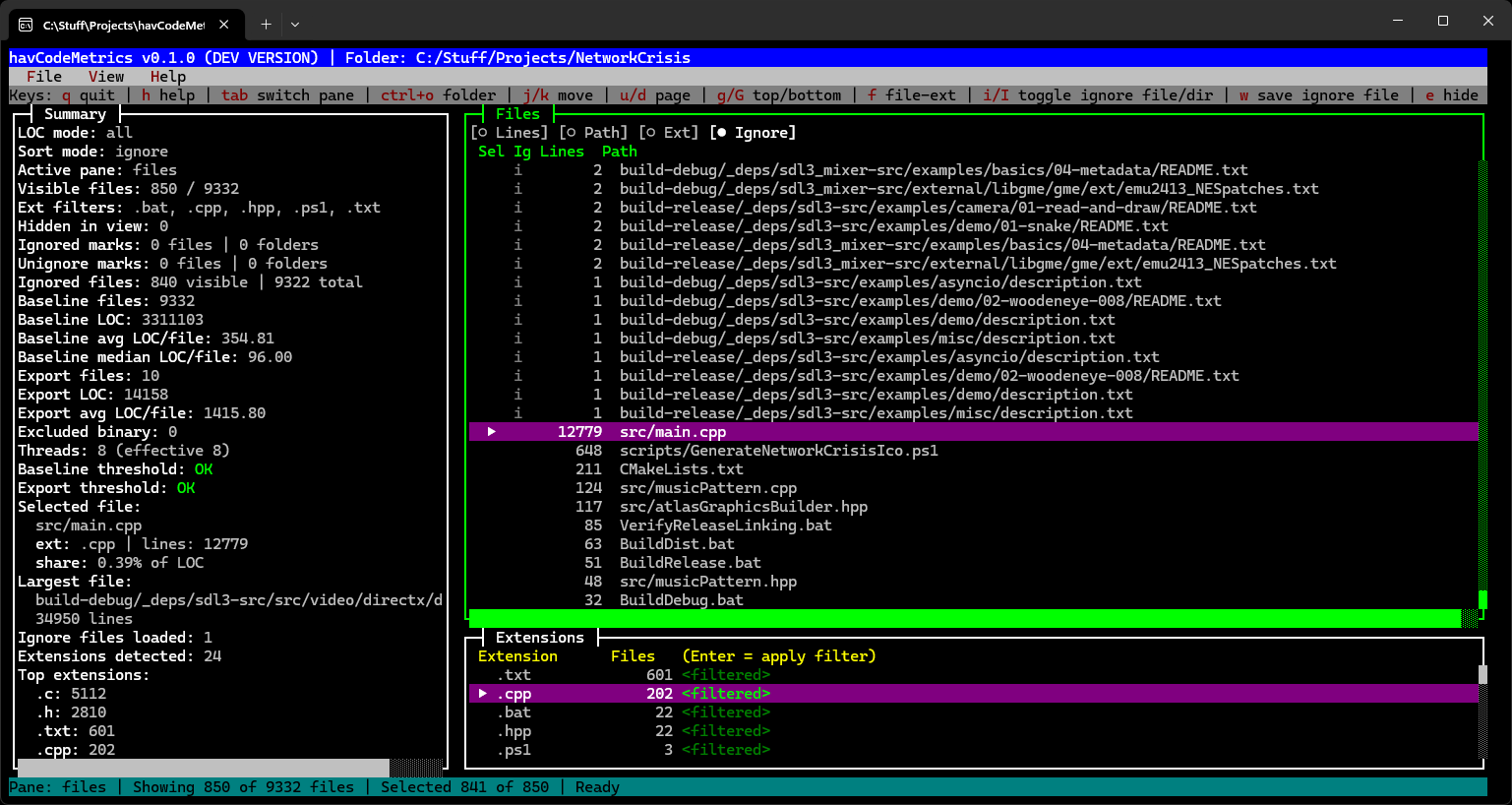 The metrics are generated by havCodeMetrics, a TUI tool I built in C++23 using havTermKit, inspired by cloc.