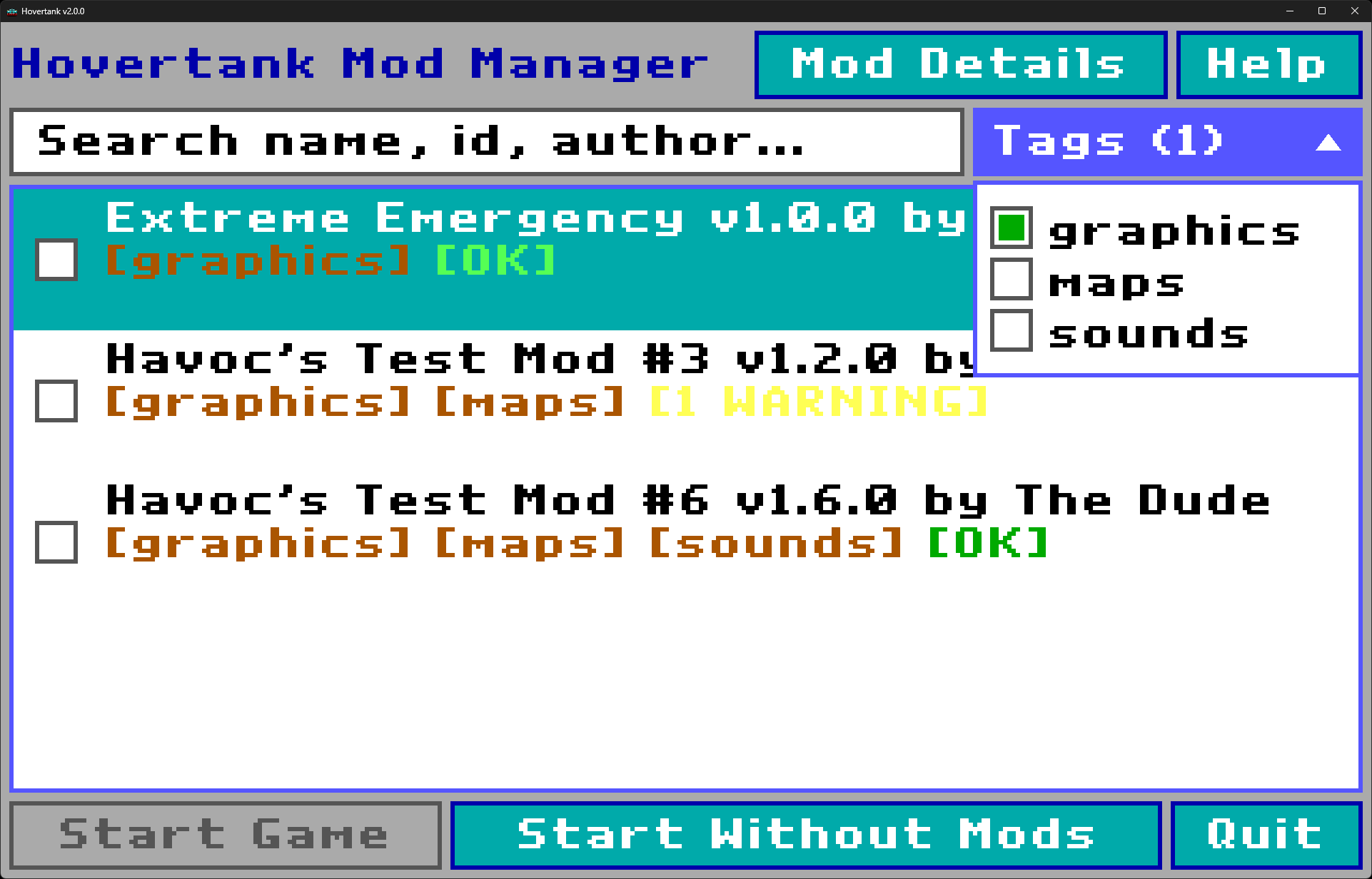 I've continued working on the Hovertank Mod Manager and added a multi-select tags dropdown, replacing the old tag-in-search approach. This now lets you search mods by name, ID, or author while filtering by multiple tags at the same time.